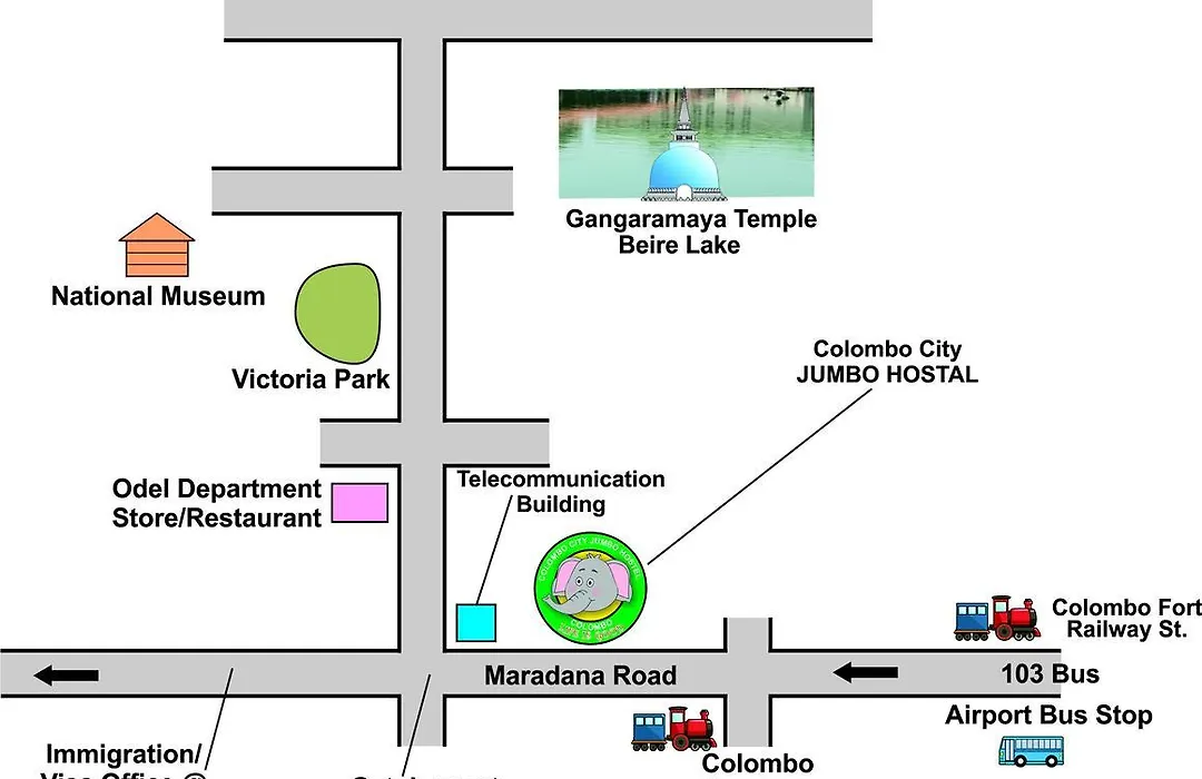 Ubytování se nachází 1 km od Národní muzeum Šrí Lanky a 2 km od Golfový klub Royal Colombo. Colombo City Jumbo Backpackers Hostel se skládá z 14 pokojů s osobním počítačem, psacím stolem a satelitním TV.